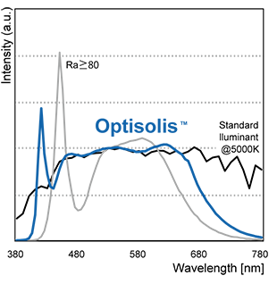 これまでの高演色性LEDが抱えていた480nm付近や600nm以上の落ち込みをカバーして、440nm付近の突出を抑えることに成功しています。