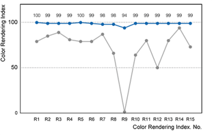 演色評価数についても、左図のように、現在、一般照明で広く使われている演色性の高い従来商品に比べても(当社比)、大きく改善しております。またUV放射がほぼ含まれないことで、それを含む光源に比して、照射物の劣化を最小限に留めることができるものと考えております。